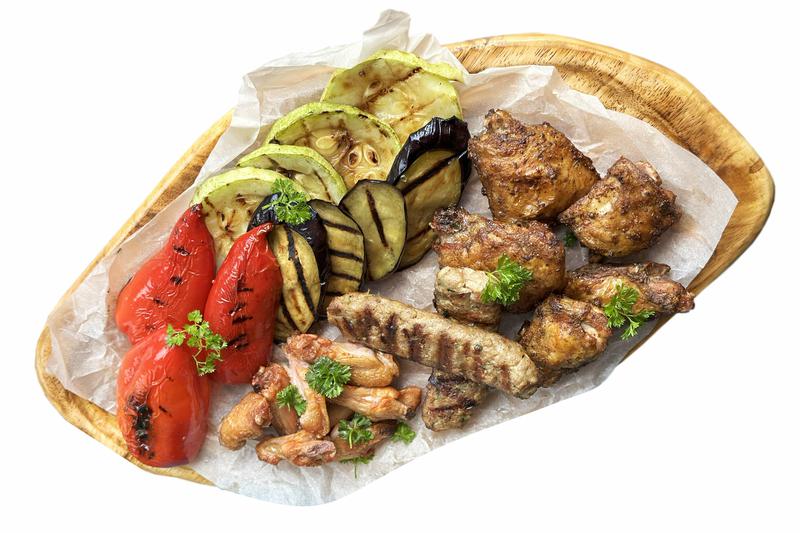 Состав: Шашлык куриное бедро – 300 гр., люля куриный – 1 порция., куриные крылья с легкой остринкой и ароматом дымка – 200 гр., овощи гриль – 1 порция