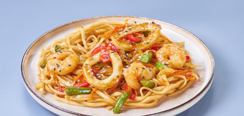 Состав: Креветка, кальмар, лапша рамен , соус вок, кунжут, масло подсолнечное, лук репчатый, морковь, стручковая фасоль, пекинская капуста, болгарский перец