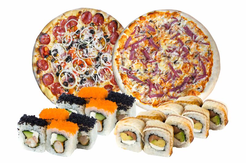 Состав: Пиццы: инферно, сборная, роллы по 8 штук: шахматы, токио