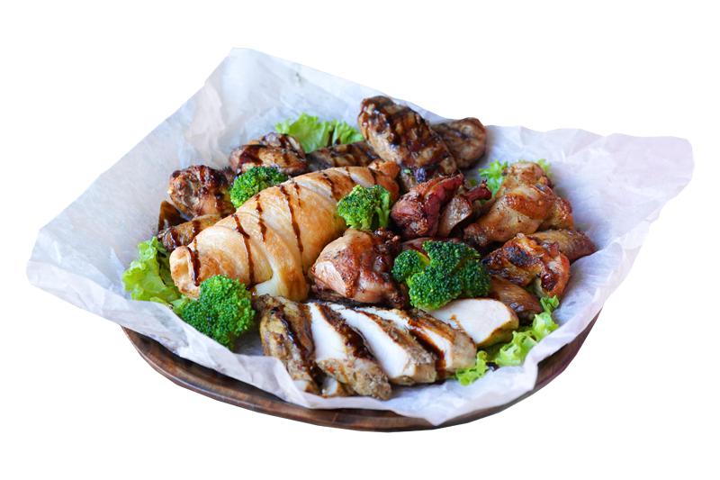 Состав: Хачапури на мангале, люля-кебаб куриный, филе куриное маринованное, крылья куриные на гриле, шашлык из куриных бедер, капуста брокколи, микс салата