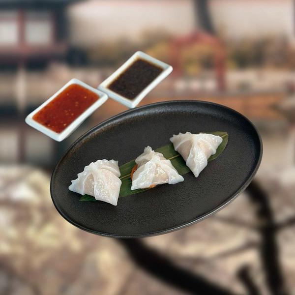 Состав: Тесто для дим-самов рисовое, начинка (фарш из говядины, кинза, лук репчатый, яйца, мята, специи, устричный соус, соевый соус). Подаются с соусами