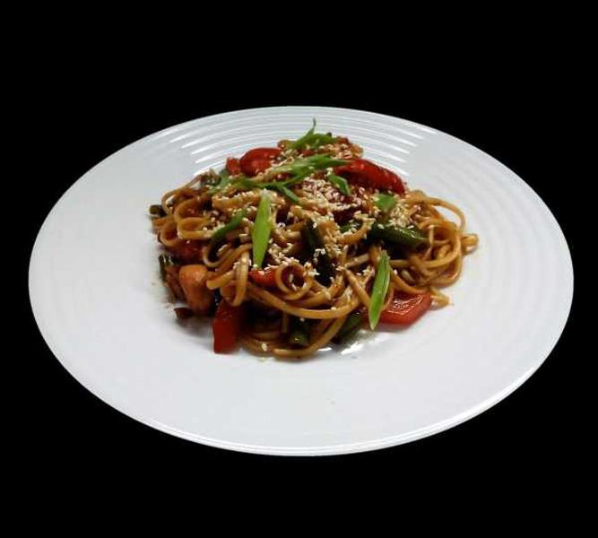 Состав: Лапша удон, перец болгарский, фасоль стручковая, капуста пекинская, грудка копчёная, ким чи, кунжут, лук зелёный.