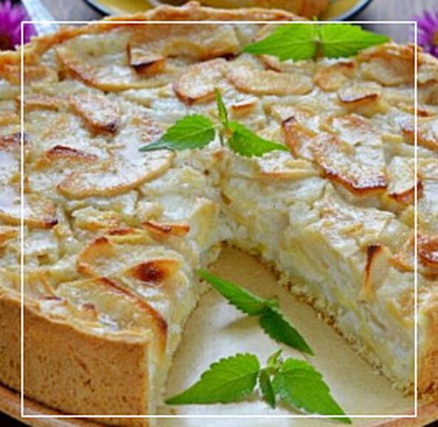 Состав: Тесто сметанно-песочное, груши, сметанная заливка.