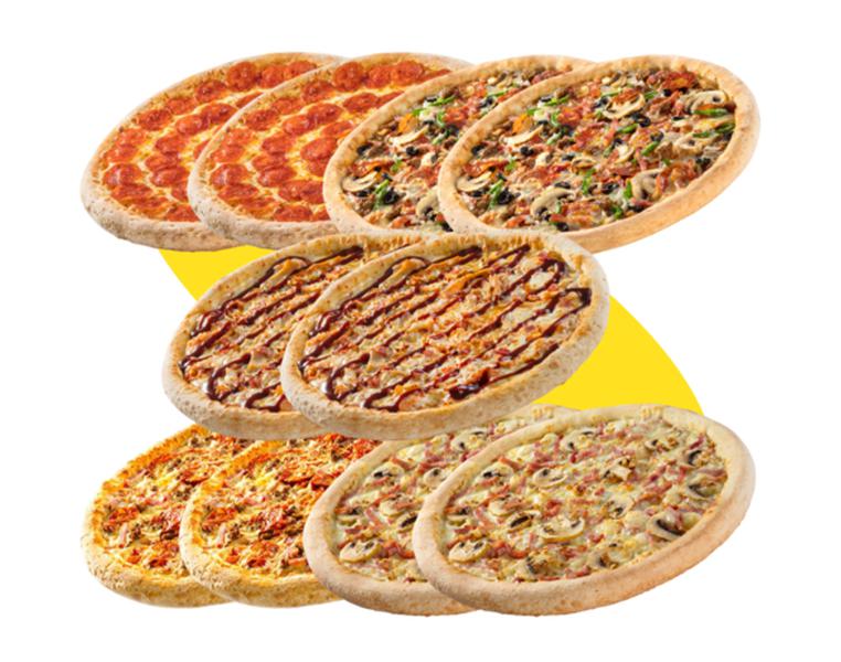 Состав: Пиццы 30 см: пепперони (2 шт), супер папа (2 шт), ветчина и грибы (2шт), цыпленок барбекю (2 шт), мясная (2 шт).