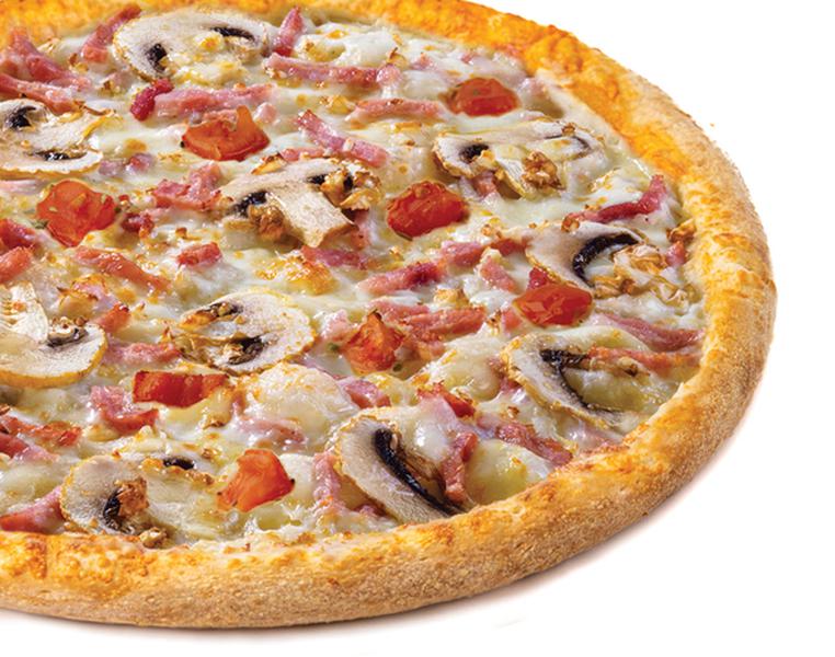 Состав: Итальянская классика! Сыр моцарелла, шампиньоны, ароматная ветчина, сочные томаты с фирменным томатным соусом