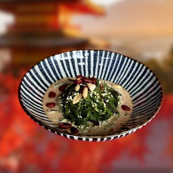 Состав: Салат хияше вакаме маринованный, орех арахис, соус кунжутный, кинза