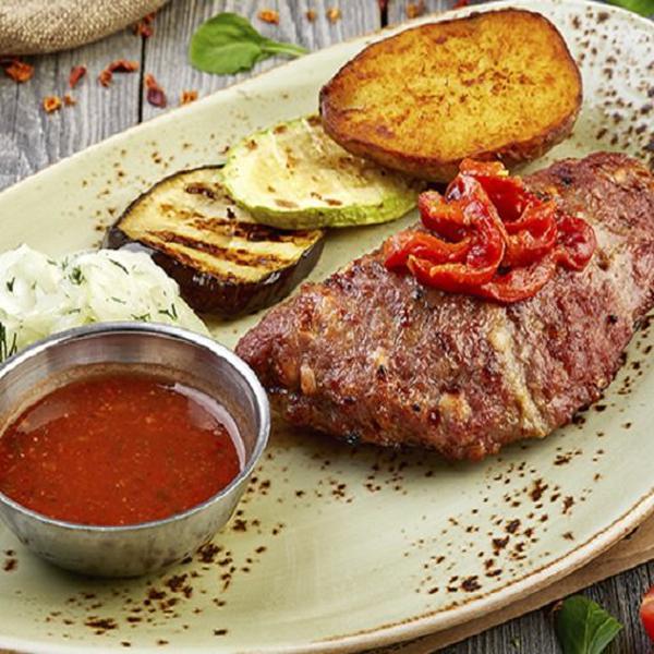 Состав: Нежный бифштекс из говядины с голландским сыром и беконом, фаршированный сыром сулугуни и болгарским перцем. Подается с жареным картофелем, овощами на гриле и томатным соусом