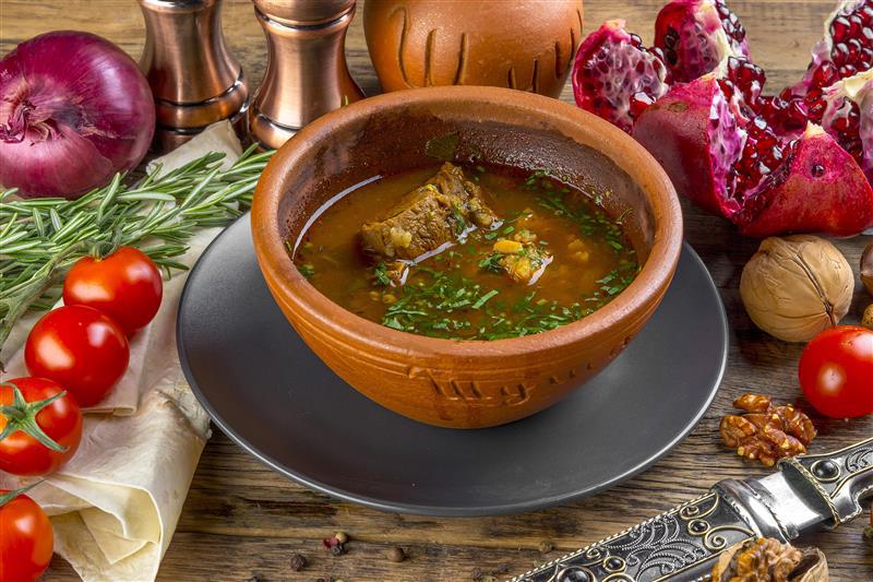 Состав: Традиционный грузинский суп из говяжьей грудинки с рисом и ароматными специями.