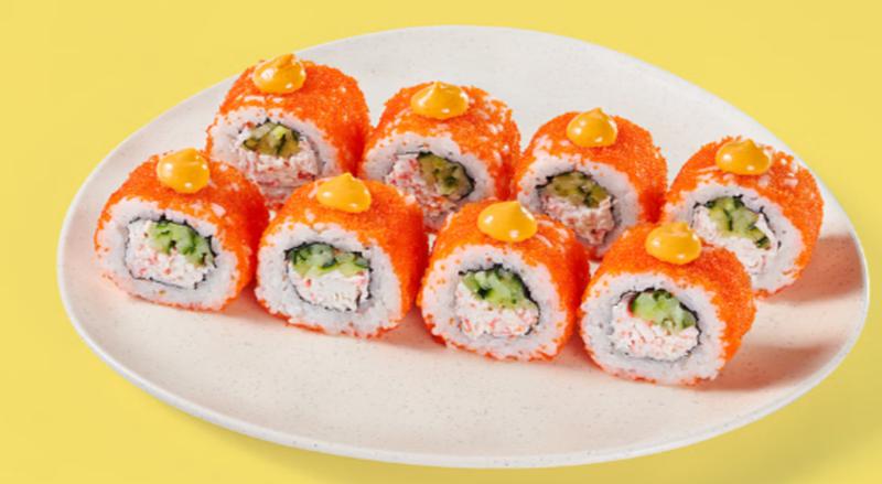 Состав: Крабовые палочки, огурец, икра масаго оранжевая, спайси соус, рис, нори. *Не забудьте заказать имбирь, васаби и соевый соус. Они не входят в стоимость заказа.