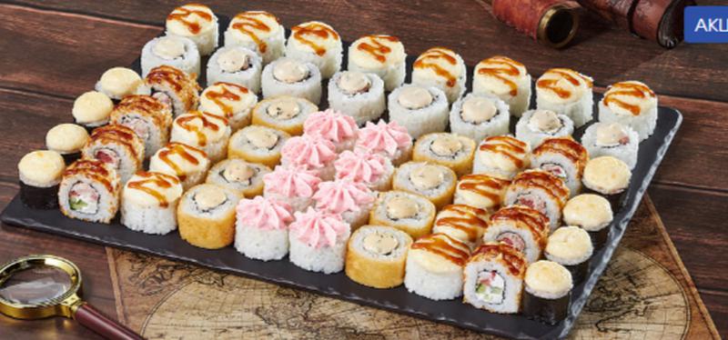 Состав: Ролл Кентукки (8 шт), ролл Кракатау с крабом (8 шт), ролл Кентукки хот (8 шт), ролл Охотский краб (8 шт), ролл Египетская курица (8 шт), ролл Мальта с сыром (8 шт), ролл Монтана (8 шт). *Не забудьте заказать имбирь, васаби и соевый соус. Они не входят в стоимость заказа.