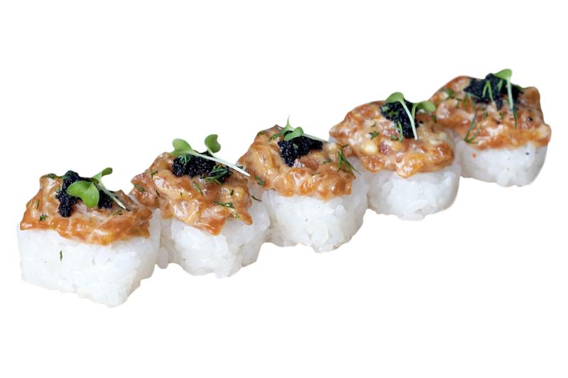 Состав: Рис, креветка тигровая, майонез, соус Унаги, икра тобико, микрозелень