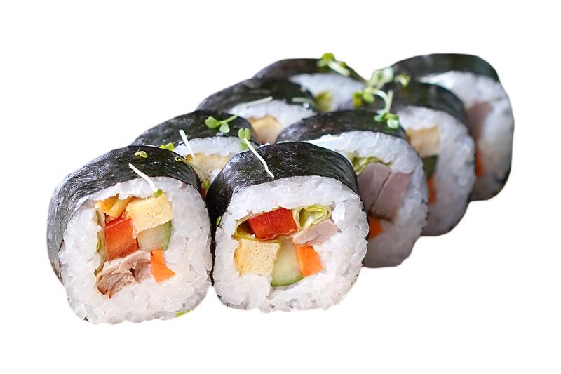 Состав: Рис, говядина, сливочный сыр, нори, омлет японский, огурцы, микс салата, перец болгарский, морковь