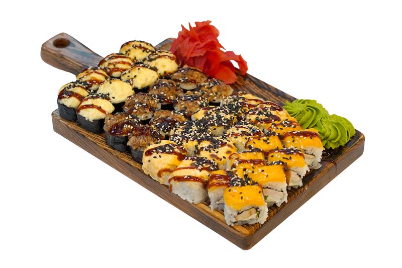 Состав: Адзума (нори, рис, сливочный сыр, жареное куриное филе, помидор, сыр, соус спайси, соус унаги, кунжут); Бандай ( нори, рис, сливочный сыр, лосось, шампиньоны, сыр моцарелла, майонез, соус унаги, кунжут); Иваки (нори, рис, огурец, пекинская капуста, зелёный лук, угорь копченый, лосось, соус унаги, кунжут); Тёкай ( нори, рис, сливочный сыр, жареное куриное филе, зелёный лук, сыр чеддер, соус унаги, кунжут); имбирь маринованный , васаби, соус соевый