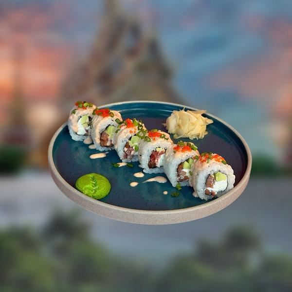 Состав: Рис, сыр творожный, тунец, лосось, авокадо, тобико, соус минтайко (майонез, икра минтая, специи)