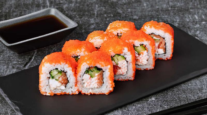 Состав: Лосось, краб-микс соус, японский соус, огурец, оранжевая икра масаго, рис, нори