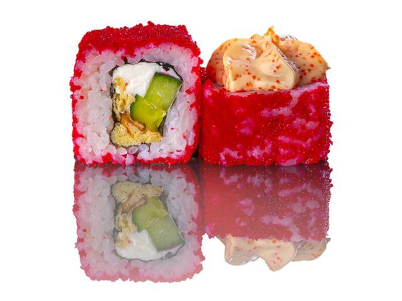 Состав: Омлет, соус лава лайт, сыр творожный, омлет, огурец, икра масаго.