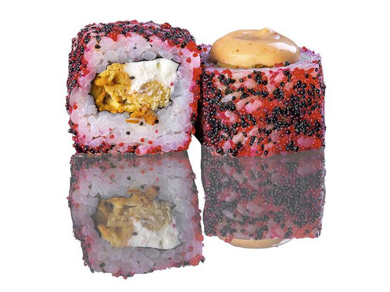 Состав: Сыр творожный, омлет, масаго, лук жареный, спайси соус.