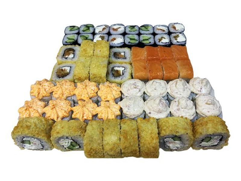 Состав: Филадельфия лайт, лава лайт с крабом, нежный с беконом, коми, хрустсалмон, сяке кунсей чиз, ролл с огурцом